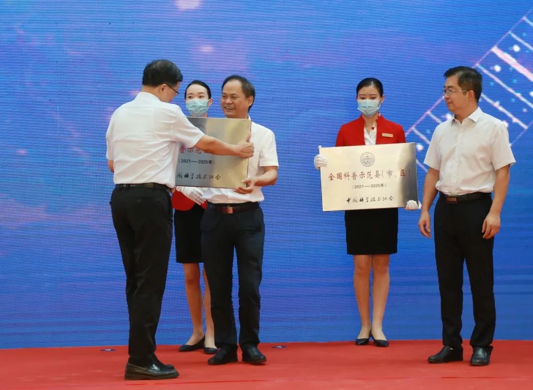 洪山区委常委、区委办主任严湘桃代表洪山区上台领取“全国科普示范区”奖牌,区科协负责人参加启动仪式。9月1日,中国科协颁布2021-2025年度第一批全国科普示范县(市、区)名单,共有53个县(市、区)获此称号,其中武汉市仅有2个区上榜,洪山区连续三次获得殊荣。