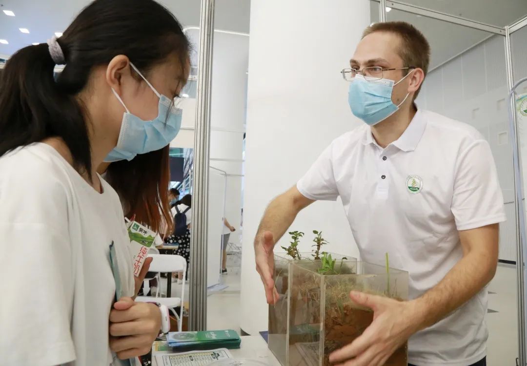 中国科学院武汉植物园别出心裁地设置体验式“盲盒”,市民将手伸进“盲盒”中,真实感受蚯蚓的生存土壤环境,通过显微镜观察千足虫、蜈蚣等土壤动物形态,现场还有外籍志愿者讲解“生态系统里的土壤工程师”。中南民族大学民族学博物馆则展示了生动有趣的非遗技艺——扎染手工艺,市民们争相体验。