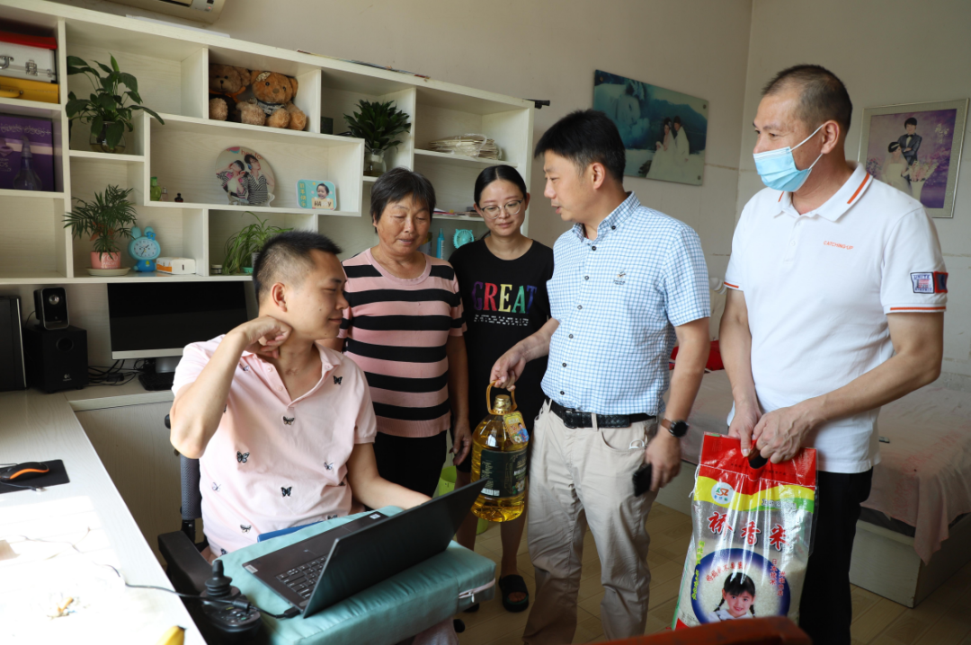 在走访脱贫户叶俊军家中,一进门就看到坐在轮椅上的叶俊军正在使用电脑进行电商数据整理。大家为其在党的政策扶持下,在艰辛中自强,在逆境中奋斗,用勤劳的双手创造新生活的精神而欣喜,并鼓励他们要保持乐观向上的生活态度,积极发展生产增加收入,不断提高生活质量,让日子越过越红火。
