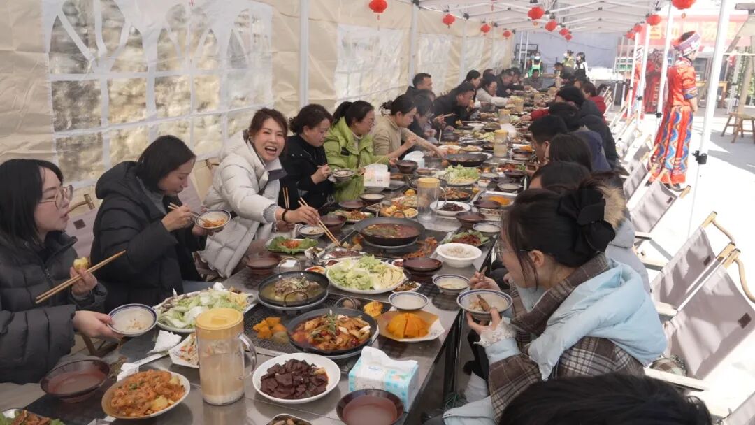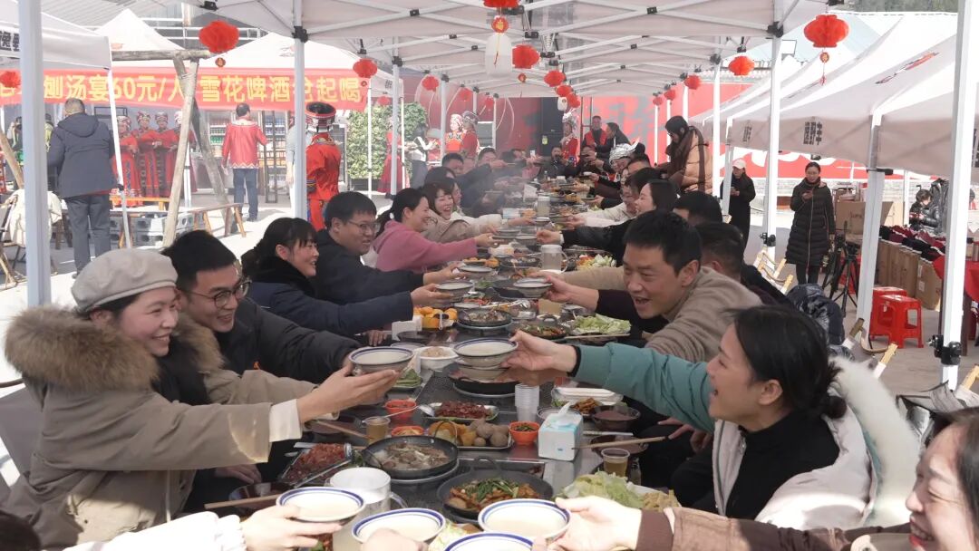 “幺妹儿,上菜哦……”在一声声吆喝中,宾客们大口吃肉,大声高歌,欢声笑语充满了整个小院。“这个肉太好吃了,我看到这个猪肉都是现杀的,下到汤里面特别的新鲜,而且边吃还可以看到很多民俗表演,特别开心,真的是有过年的氛围了。”游客黄迪和朋友们认真的品尝着碗中的美食。