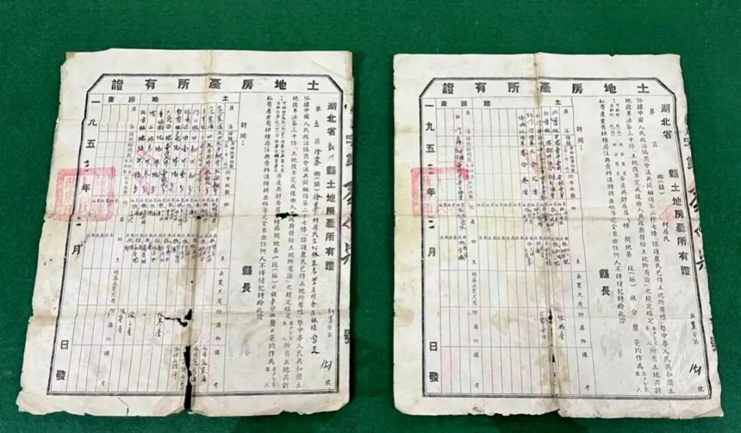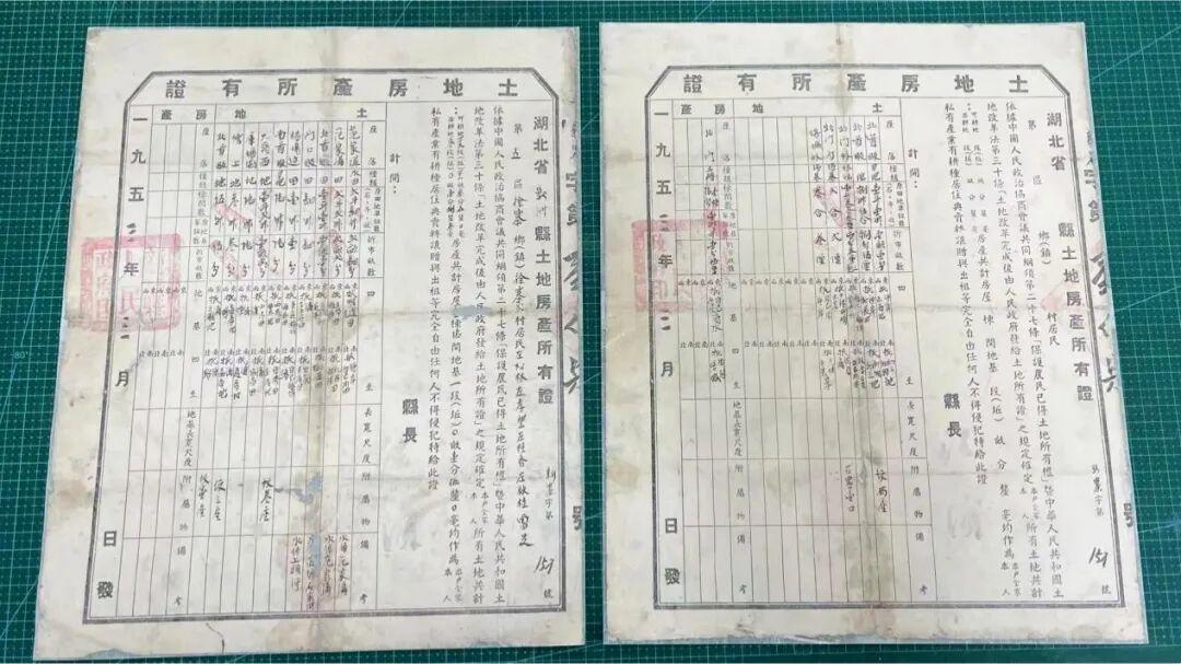 据历史资料记载,1950年,《中华人民共和国土地改革法》颁布,一场彻底废除封建土地所有制的运动在全国展开。湖北省于1952年至1953年完成农村土改。这两张《土地房产所有证》,正是实现“耕者有其田、居者有其屋”的历史凭证。证书上详细记载了户主姓名、家庭人口、土地与房屋坐落位置、四至范围及面积等关键信息,以官方文书形式,宣告湖北农村延续数千年的地主占有制走向终结。