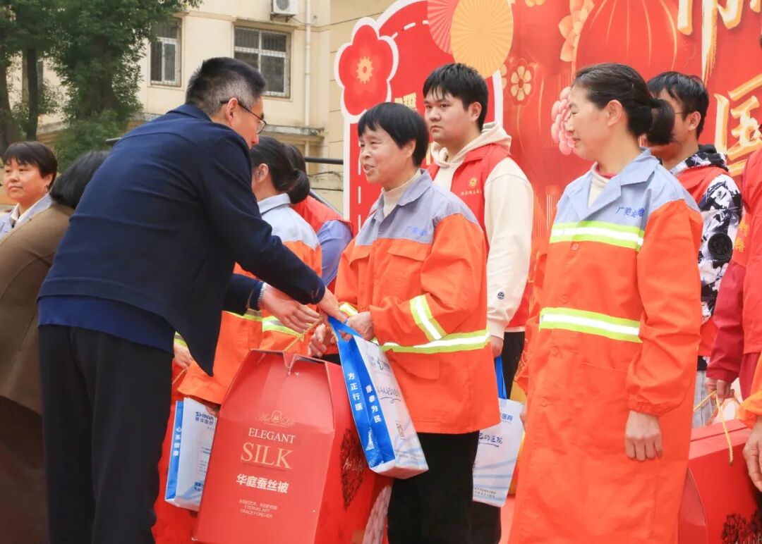 活动现场,区委常委、区委(区政府)办公室主任杜银川及相关单位负责人为困难户外工作者代表赠送新春慰问礼包。礼包内含蚕丝被、保温杯、春联套盒及实用工具盒,传递出对一线劳动者的真切关爱。