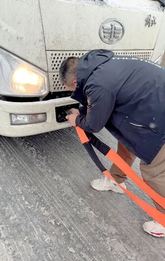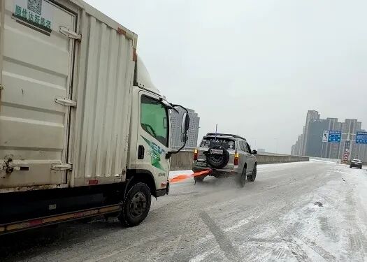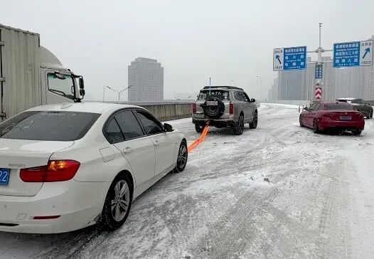 作为一名越野爱好者,詹时美的车上常年备有拖车绳等工具。担心不够用,他又从家里取出一根带上。由于大雪导致交通不畅,他花费40分钟才绕行至堵车现场。抵达后,他迅速投入救援,逐一帮助受困车辆拖车上坡。