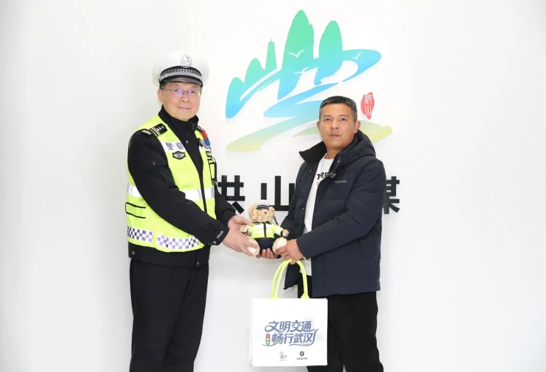 1月22日下午,詹时美应邀走进洪山区融媒体中心,面对面还原了那个风雪中的温暖场景。洪山交警也专程前来,为他送上象征感谢与认可的“警察小熊”玩偶,并对他在极端天气中自发参与交通疏导、帮助受困车主的善举表示充分肯定。