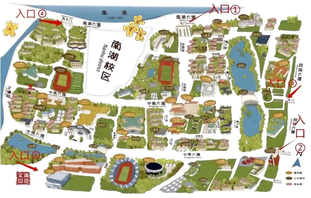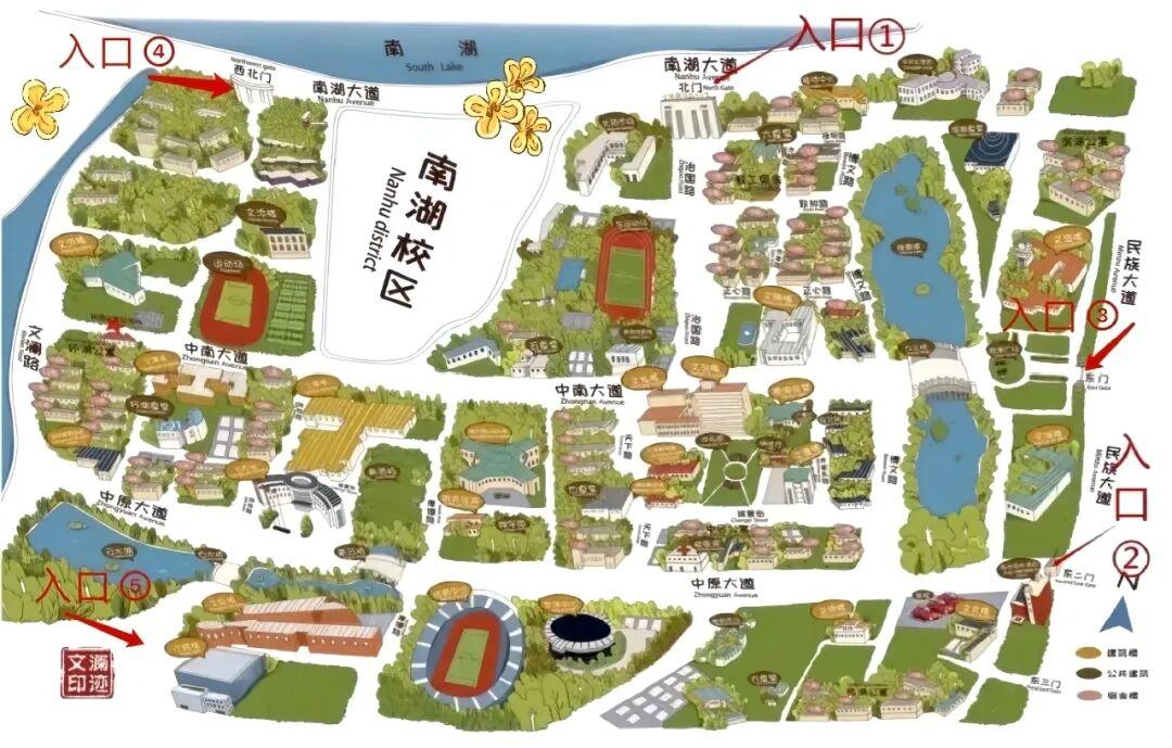 校园建筑的命名独具匠心,自成体系,尽显人文底蕴:文澜楼,南湖校区第一座现代化教学楼,纪念首任校长范文澜先生。文波、文泰、文泉楼,楼名皆“从文从水”,寓意“波澜不惊”“稳如泰山”“思源致远”。