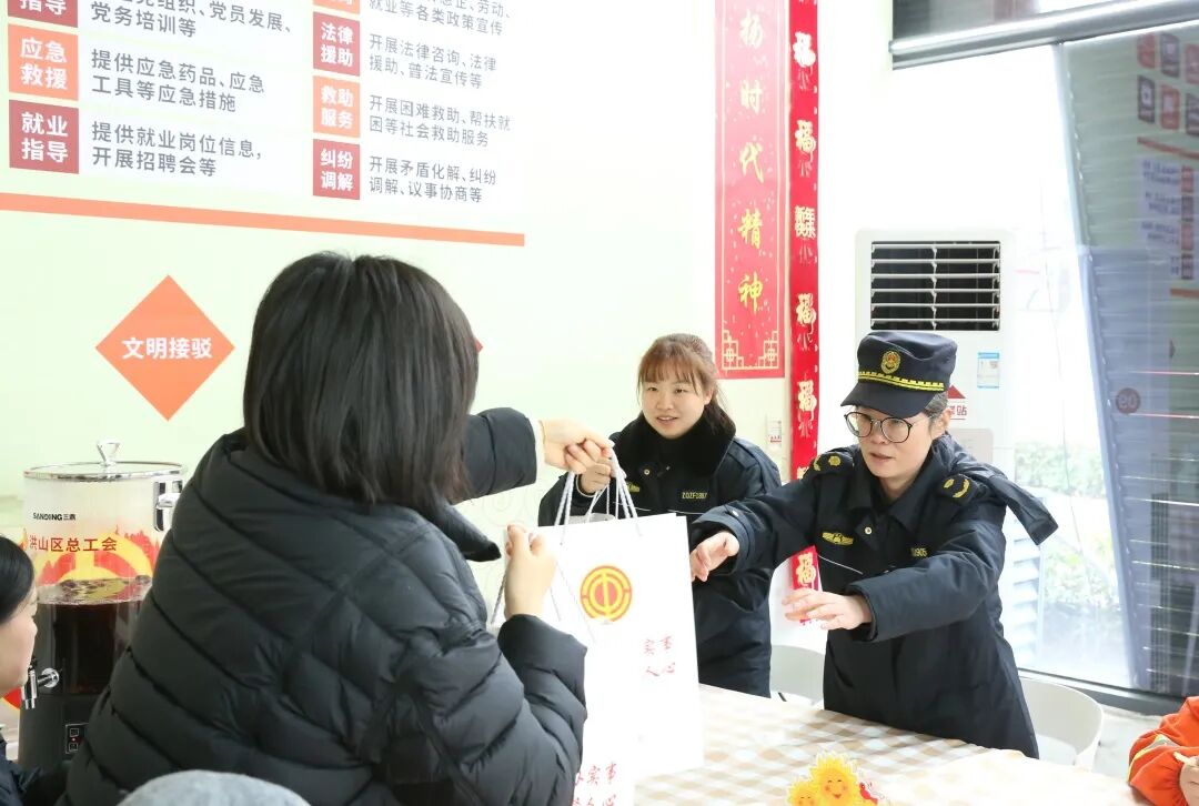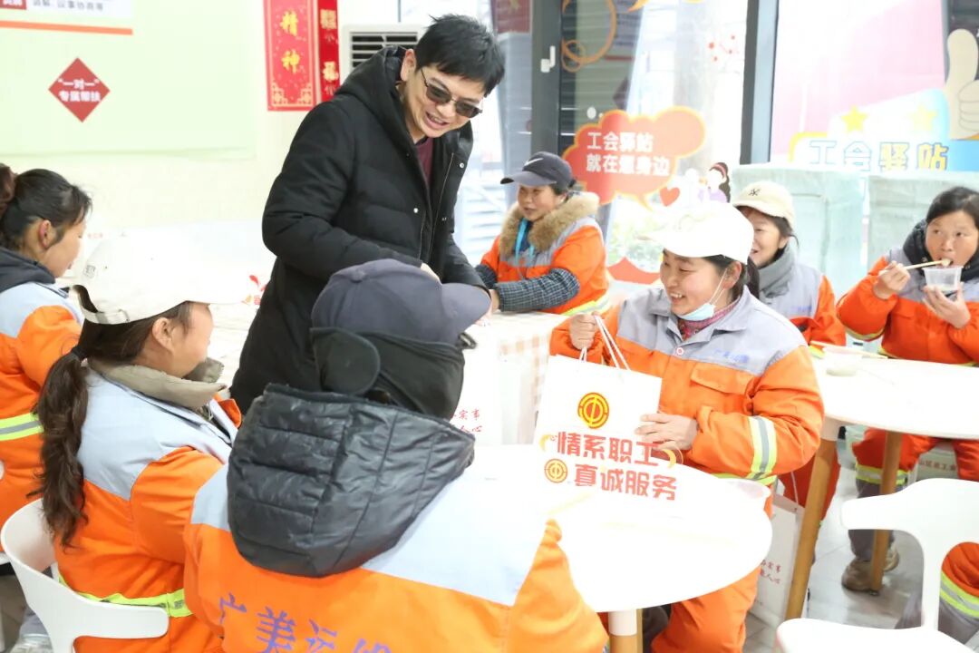 “来来来,大家趁热吃!节日快乐!”工作人员热情地招呼着,将一碗碗热气腾腾的汤圆和一份份精心准备的慰问物资递到大家手中。“干了这么多年保洁,每年过节都是最忙的时候,家里人也都习惯了。没想到今天能在驿站里收到工会送的汤圆,这心里啊,一下子就热乎了。”环卫工人李大姐接过慰问品笑着说。小小的驿站里挤满了人,大家围在一起,咬一口软糯的汤圆,喝一口热气腾腾的热饮,暖意从胃里一直蔓延到心里。