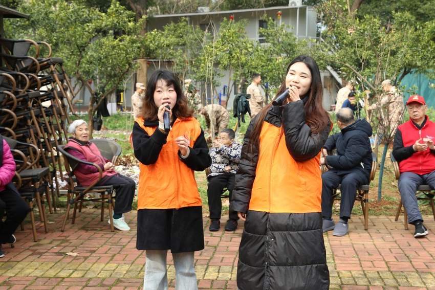 在文艺演出的同时,贴心的生活服务也在同步进行。来自陆军工程大学军械士官学校的官兵们分组行动,一部分拿起扫帚、抹布,认真细致地打扫公共区域卫生,擦拭门窗玻璃,清理卫生死角,为老人们营造更加整洁舒适的居住环境;另一部分则来到中心后院的“爱心菜园”,挥锹铲土,翻整土地,为即将开始的春种做好准备。官兵们干劲十足,汗水浸湿了衣背,但脸上洋溢着服务他人带来的满足感。