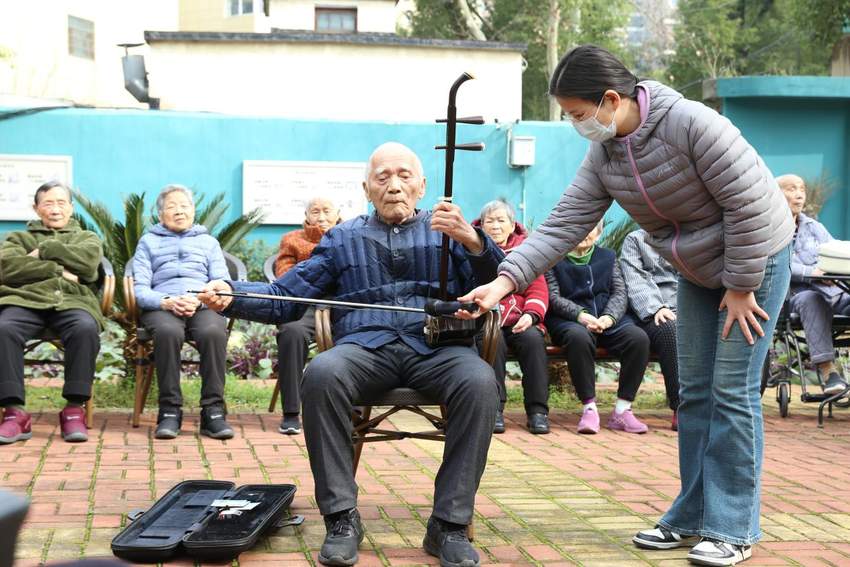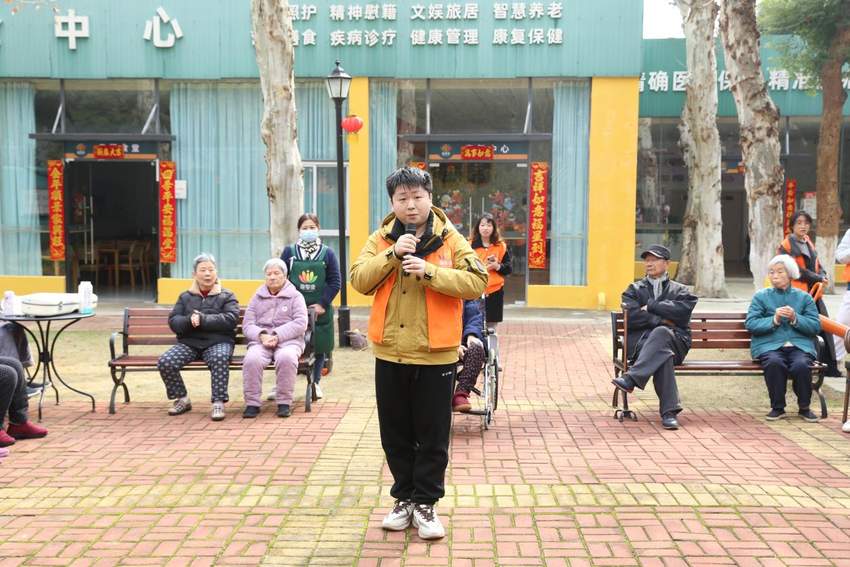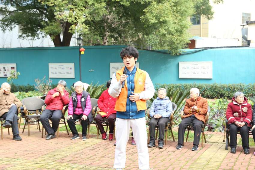 活动当天,阳光明媚,春风和煦。狮子山街综合养老服务中心内洋溢着欢声笑语。在养老服务中心的小广场上,一曲由华中师范大学音乐学院学生志愿者带来的《多情的土地》率先唱响,将对祖国的热爱与对故土的眷恋娓娓道来。一旁的爷爷奶奶竖起大拇指,连连称赞“歌声嘹亮”。随后,熟悉的《风吹麦浪》旋律响起,轻柔的曲风仿佛将金黄色的麦田带到了眼前,不少老人不自觉地跟着节奏轻轻挥动起手臂,打着节拍,脸上洋溢着陶醉的笑容。
