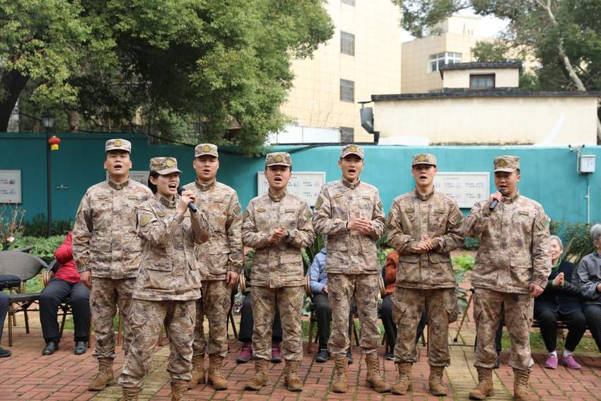 演出接近尾声时,在老人们的热烈邀请下,来自陆军工程大学军械士官学校的官兵们整齐列队走上舞台,应大家的要求合唱了《打靶归来》和《强军战歌》。铿锵有力的歌声,昂扬向上的精神风貌,瞬间点燃了全场的热情,不少老人也跟着节奏哼唱起来,仿佛回到了那段激情燃烧的岁月。歌声、笑声、掌声交织在一起,奏响了一曲动人的春日敬老协奏曲。