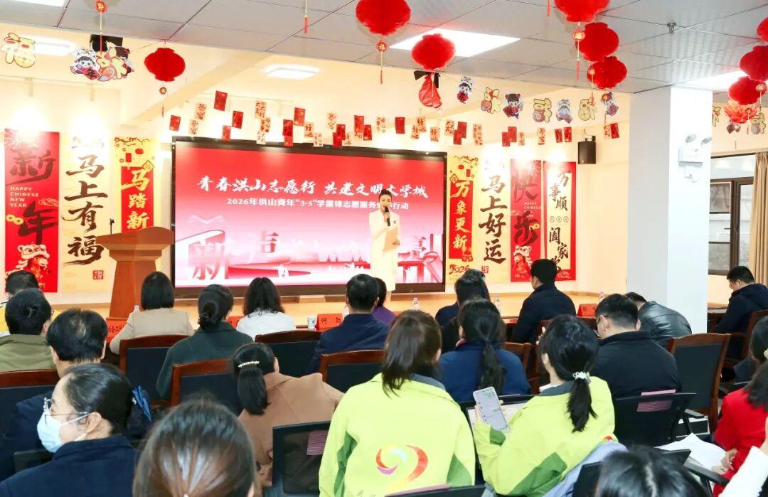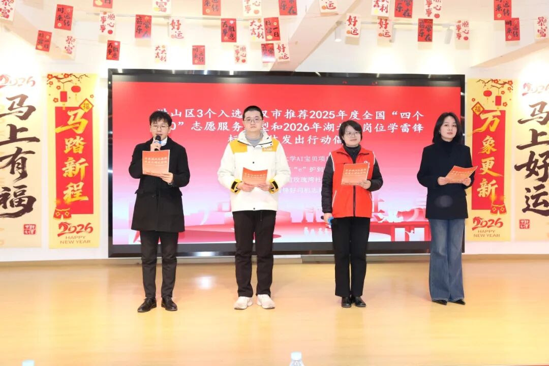 在2025年度全国“四个100”志愿服务典型和2026年湖北省岗位学雷锋标兵集体推荐中,洪山区多个集体和个人脱颖而出。活动现场,华中科技大学AI宝贝项目、武汉市中心医院“e”护到家项目、狮子山街道玫瑰湾社区、风韵出行志愿服务队代表共同登台,向全区志愿者发出行动倡议。